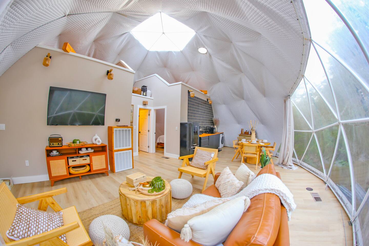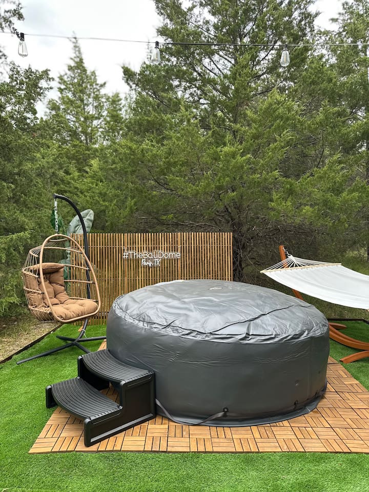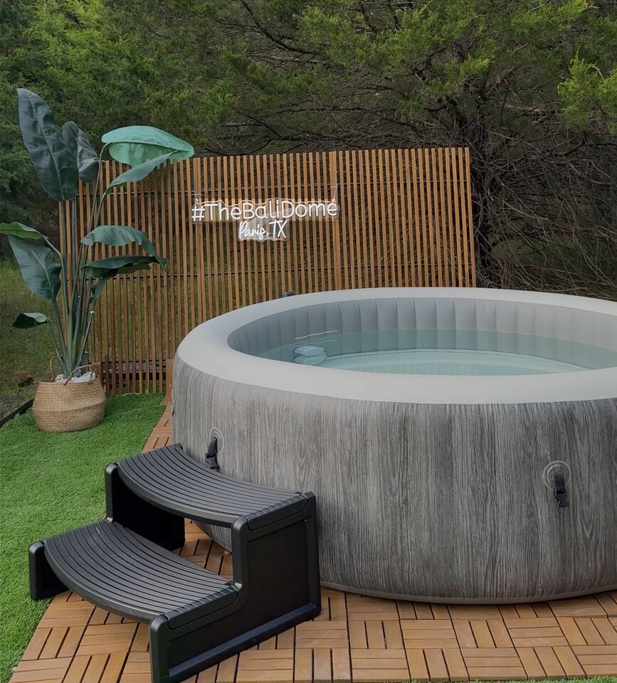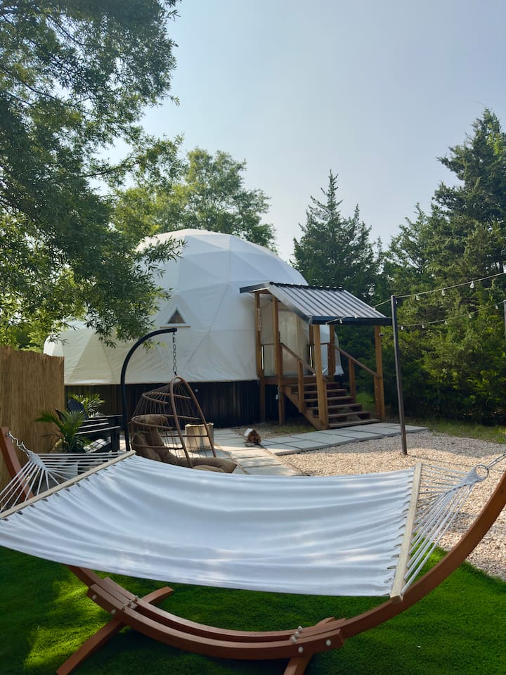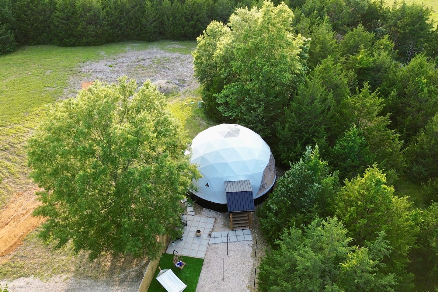Disappear into the forest. Return to yourself. The Bali Dome sits on 15 private acres of East Texas juniper and pine forest. No neighbors. No shared spaces. No noise beyond wind in the trees and birdsong. Climate-controlled, solid flooring, hotel-level comfort throughout. This isn’t camping. It’s a full luxury reset wrapped in nature. Wake Up Here Morning light filters through the retractable skylight above your bed. Twenty-foot ceilings stretch overhead. Panoramic 18ft bay window facing nothing but trees and stillness. Start the Keurig. Take your coffee outside. The hot tub is still warm from last night. The hammock is waiting. There’s nowhere to be. That’s the point. The Space One of the largest luxury domes in Texas at over twice the typical glamping size. Two private bedrooms with cloud-soft bedding. Spa bathroom with floor-to-ceiling marble, rainfall shower, and Japanese smart bidet. Powerful 5-ton A/C because this is Texas and comfort matters. Full indoor kitchen with retro fridge, luxury dishwasher, air-fryer oven, and washer/dryer. Moroccan zellige tile. Exposed wood beams. Bali-inspired details throughout. Fast WiFi when you want it. Silence when you don’t. The Outdoors Private hot tub under open sky. 400 sq ft patio with teak dining table, deep-cushion sofa set, and premium cooler. Second lounge area with hammock, egg chair, Adirondacks, and Solo Stove fire pit. Full outdoor kitchen with oversized BBQ grill. 300 feet of softly lit string lights leading to your private patio. Disc golf when you feel like moving. Most guests don’t. Details That Quietly Impress Spa slippers, vanity kits, and dental kits on arrival. Elegant table settings with quality plates and glassware. Spa-grade towels and premium linens throughout. Everything refreshed and staged before you walk in. Perfect For Romantic escapes—anniversaries, proposals, or just “we needed this” Girls’ weekends with no agenda Small families wanting nature without roughing it Solo travelers ready to recharge Creators—every angle here is intentional Good to Know You’re in a real forest. Expect dark skies full of stars and the occasional curious bug. That’s the tradeoff for true privacy and nature. Terrain is natural in places. The pond is unfenced. Keep kids close. After rain, stick to the gravel drive.